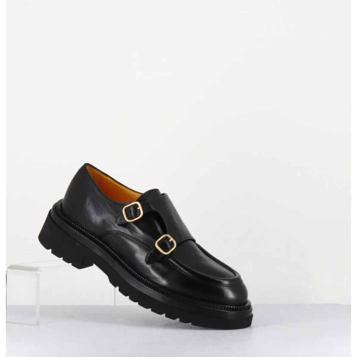 Derby double-boucle en cuir souple noir, montées sur une semelle en micro-fibre ultra légère. D’un grand confort