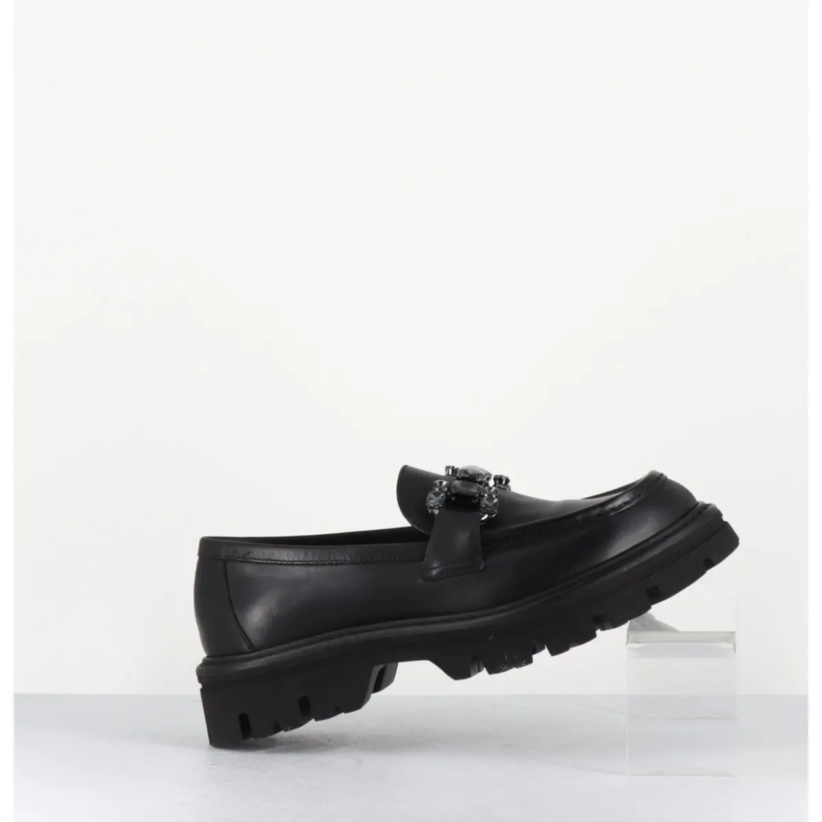Mocassins en cuir extrêmement souple noir avec mors orné de bijoux effet cristal anthracite, montées sur une semelle épaisse en micro-fibre ultra légère