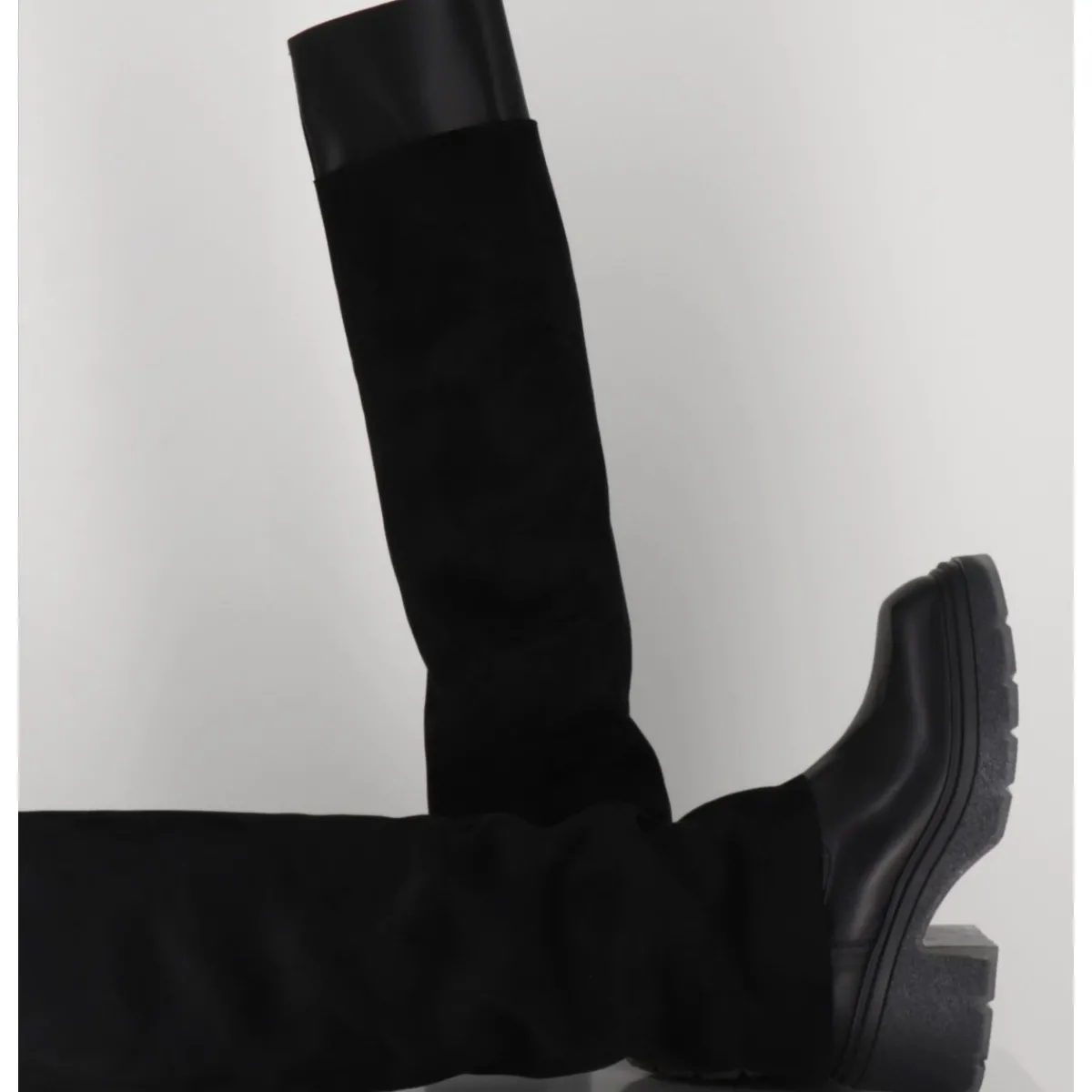 Bottes – presque genouillères en stretch noir avec guêtre en daim amovible, forme esprit bikers à bout carré montées sur une semelle en gomme crantée
